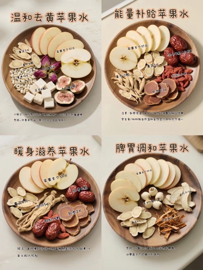 材料:苹果½个+黄芪5片+薏米10g(炒过更温和)+麦冬8颗+玫瑰5朵+茯苓6颗+无花果2颗