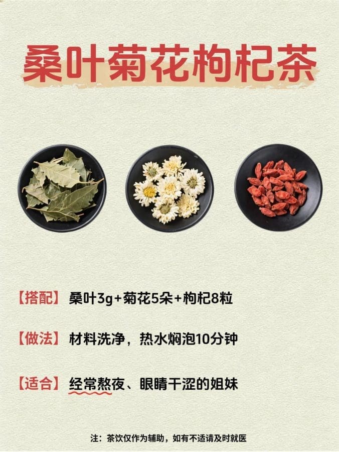 谁适合喝:天天盯电脑、刷手机的打工人、学生党!我每天对着电脑8小时,眼睛干得像要冒火,连看字都模糊,喝这个茶半小时,干涩感立马缓解,菊花和桑叶清肝火,枸杞护眼,喝完整个人都清爽,下午再也不用靠掐大腿提神了。