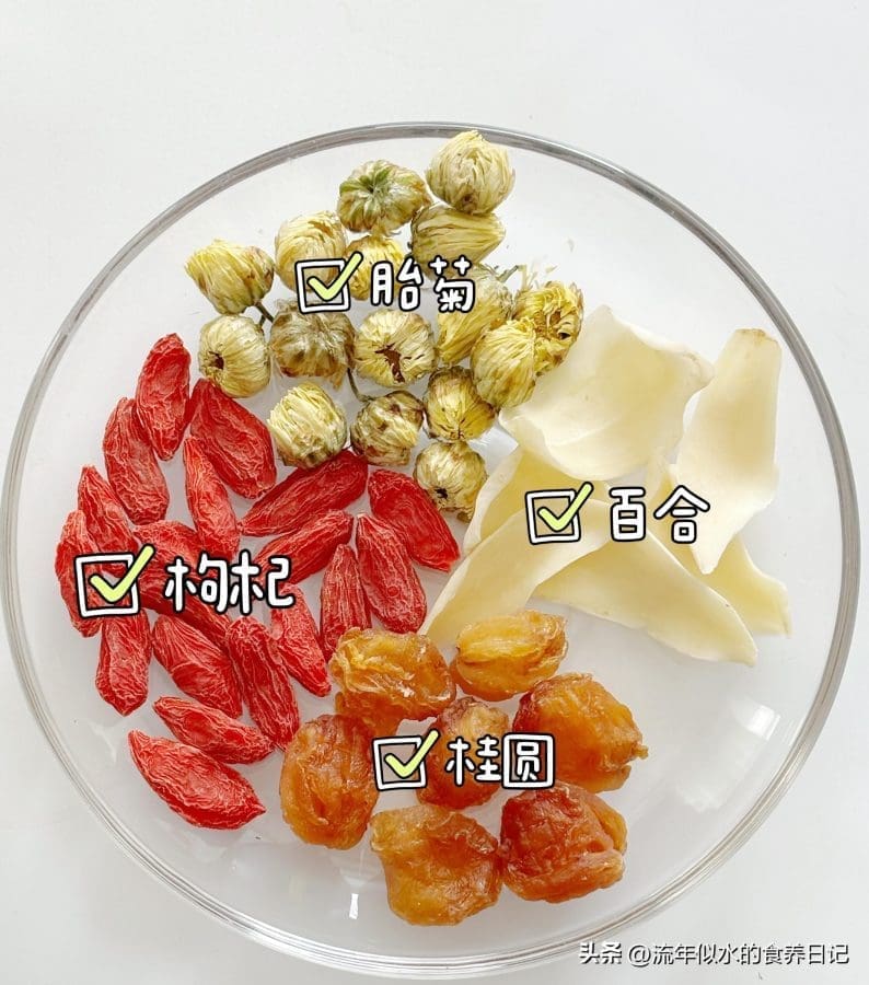 菊花清肝火(肝火大了眼睛易模糊),桂圆补气血(给眼睛“供能”),百合润燥(专治眼干),枸杞更是护眼老搭档,四样搭配,像给眼睛“做保湿”。
