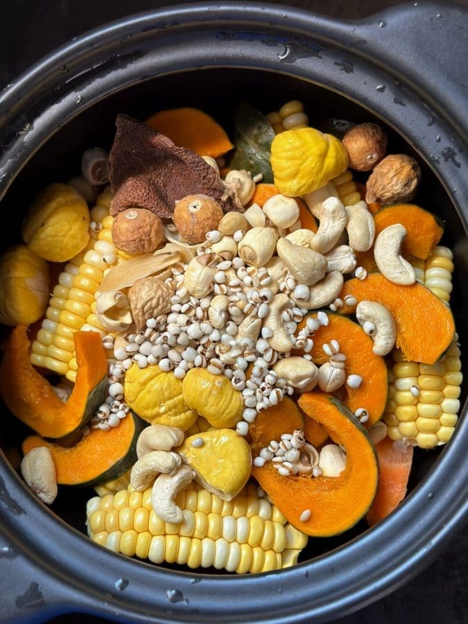 板栗去皮,南瓜一半去皮一半不去,胡萝卜去皮切块,玉米这样切煲汤更甜,所有食材洗净放入锅中,加水,大火煮沸转小火60分钟,按喜好加盐调味即可(猪骨/牛骨/瘦肉,焯水按喜好放,今天我是斋汤,油脂主要来源于腰果)