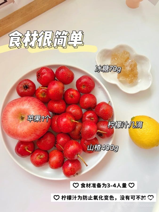 苹果1个、山楂400g、冰糖70g、柠檬汁几滴