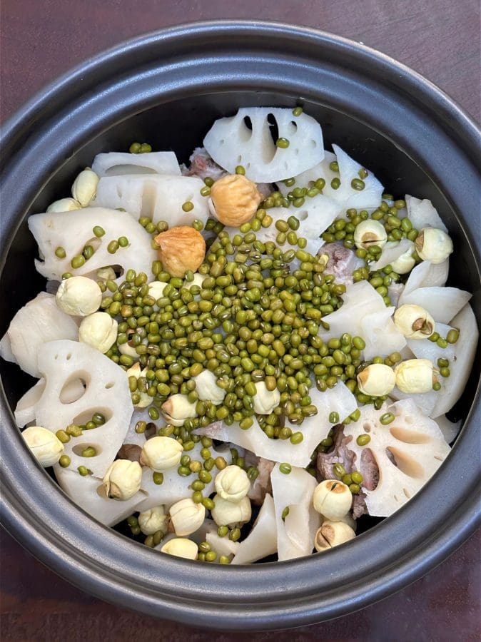 ️材料:莲藕一节、绿豆30g、莲子20g、无花果2个、排骨适量
